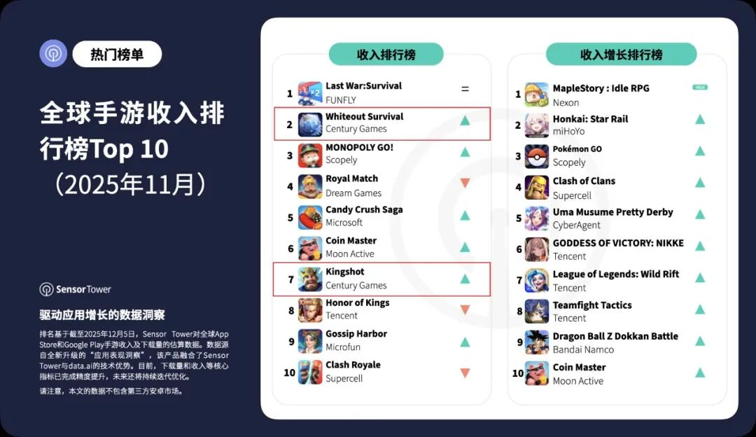 Sensor Tower榜单《Whiteout Survival》《Kingshot》排名上升